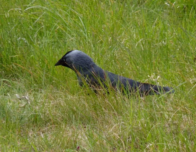 Grajilla (Corvus monedula) buscando presas en un prado semiurbano. Edimburgo, Escocia.
