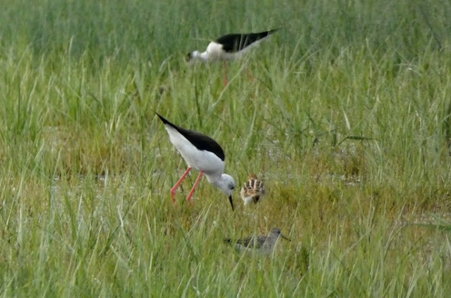 Cigüeñuelas, andarríos bastardo y agachadiza común (Gallinago gallinago). |
