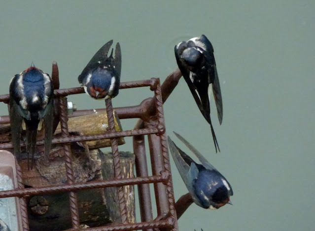 | Grupo de golondrinas comunes (Hirundo rustica) secándose tras un chubasco junto al rio Muga. Castelló d'Empúries, Girona |